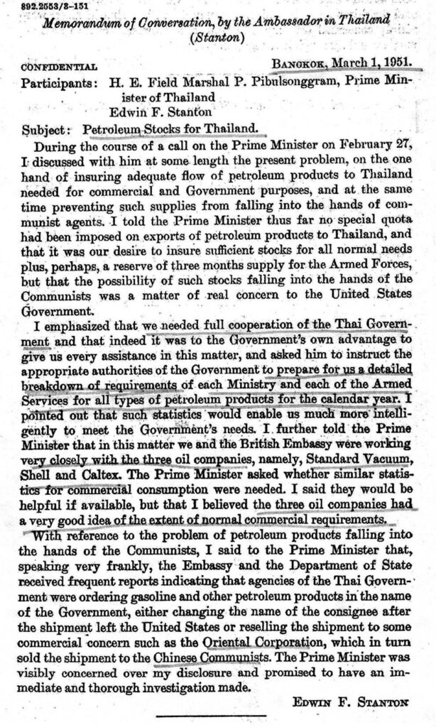 ดูอีกที มันเป็นการมาล้วงตับเรา เพราะบอกให้ทางไทย แสดงรายละเอียดความต้องการของน้ำมัน ของหน่วยงานของเราแต่ละหน่วย แต่ความจรืงน่าจะเพราะ กลัวน้ำมันไปตกอยู่ในมือคอมมิวนิสต์มากกว่า